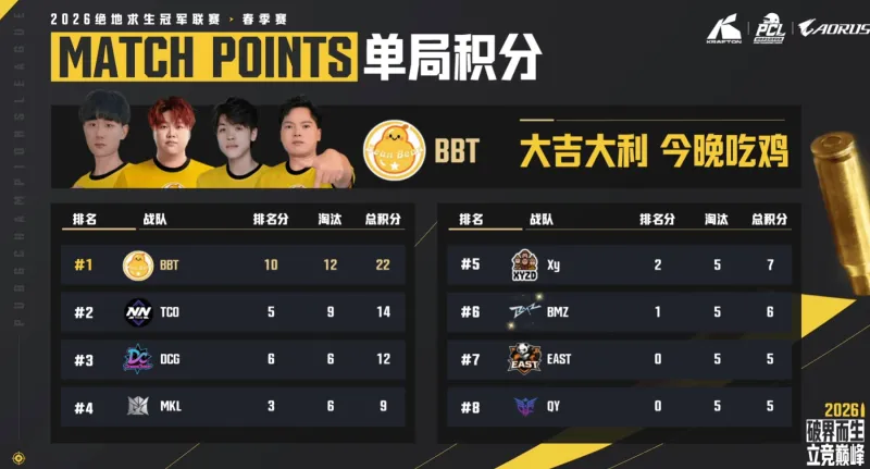 决赛圈BBT 4V4 QY,BBT占据梅花桩,率先打掉QY一人,但QY侧翼打掉BBT两人,随后自己倒地1人,2V2,BBT再被QY侧翼打倒1人,最终1V1,BBT选手依靠地势较高先出枪,完成吃鸡。