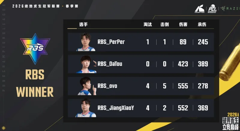 最终阶段,RBS依靠地形优势打掉XY1换2打掉2人,最终决赛圈2V1依靠人数优势完成吃鸡。